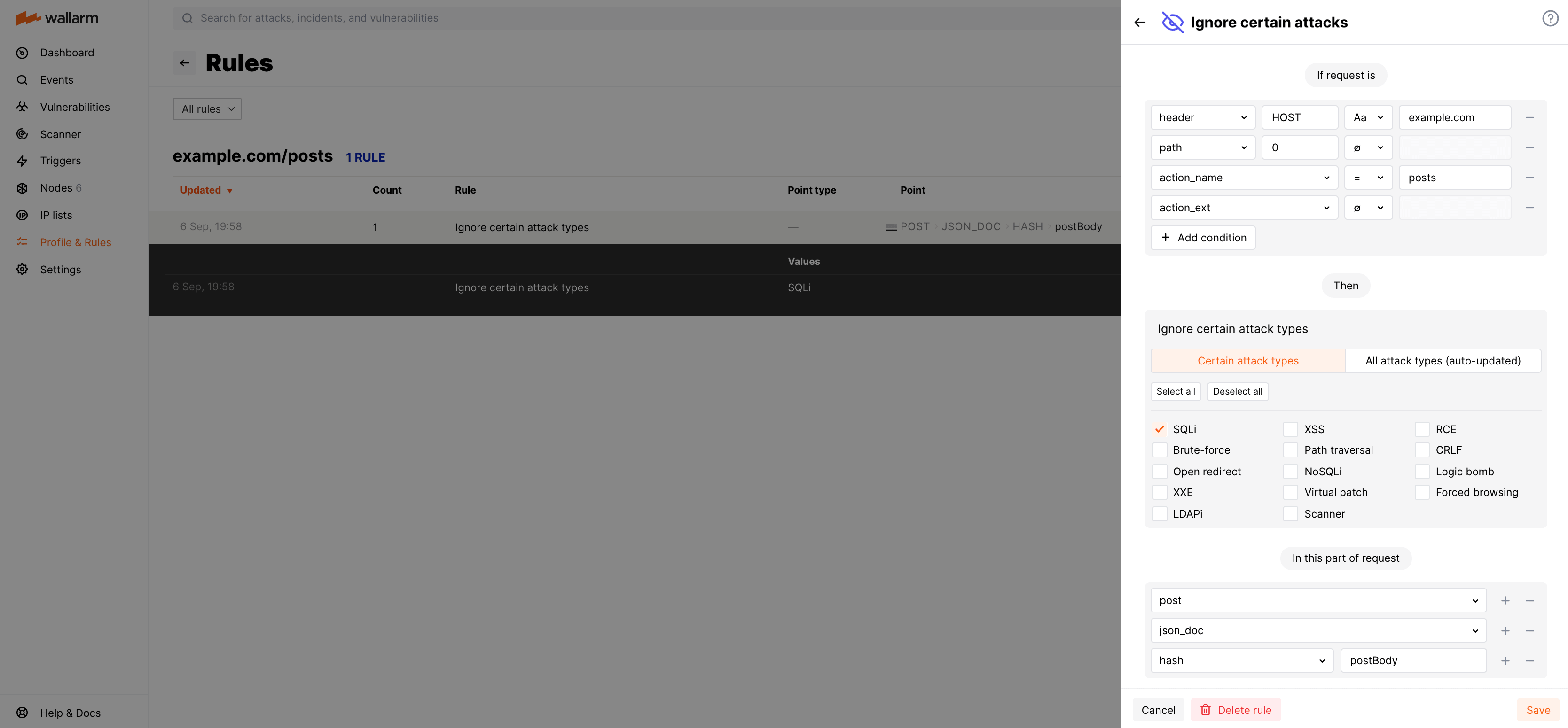 Wallarm additionally validates SQL injection attacks (libdetection library, developed by Wallarm). See how to manage.