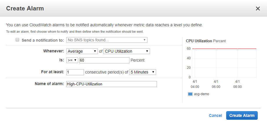 Select the action to be taken in the case the High CPU Utilization event triggers. For example, you may configure an auto scaling policy to add (using the Add action) one instance when the event is triggered.