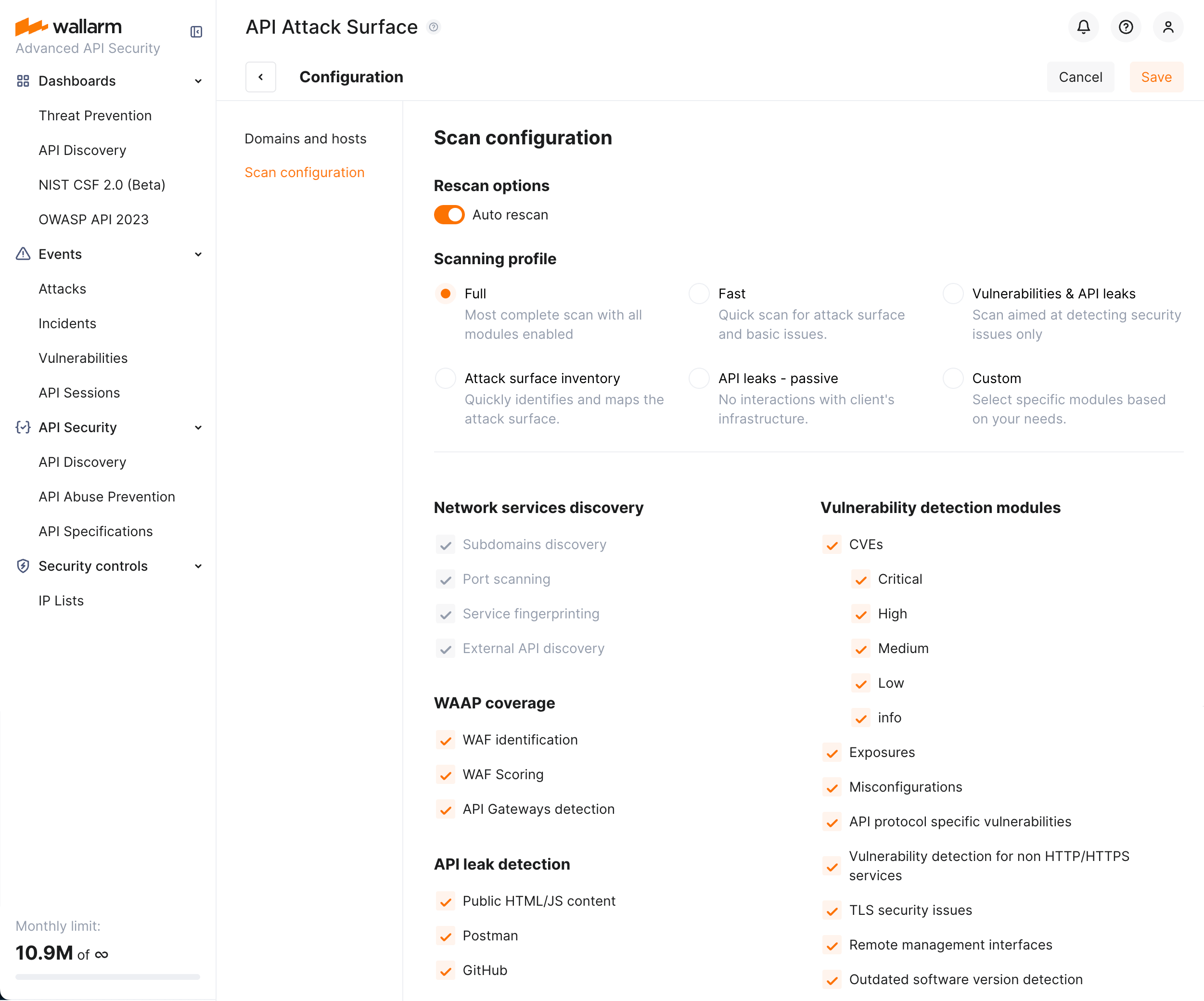 Full | Most complete scan that searches for all types of network services, fully checks WAAP coverage, searches for API leaks by all possible ways and has all vulnerability detection modules enabled. |