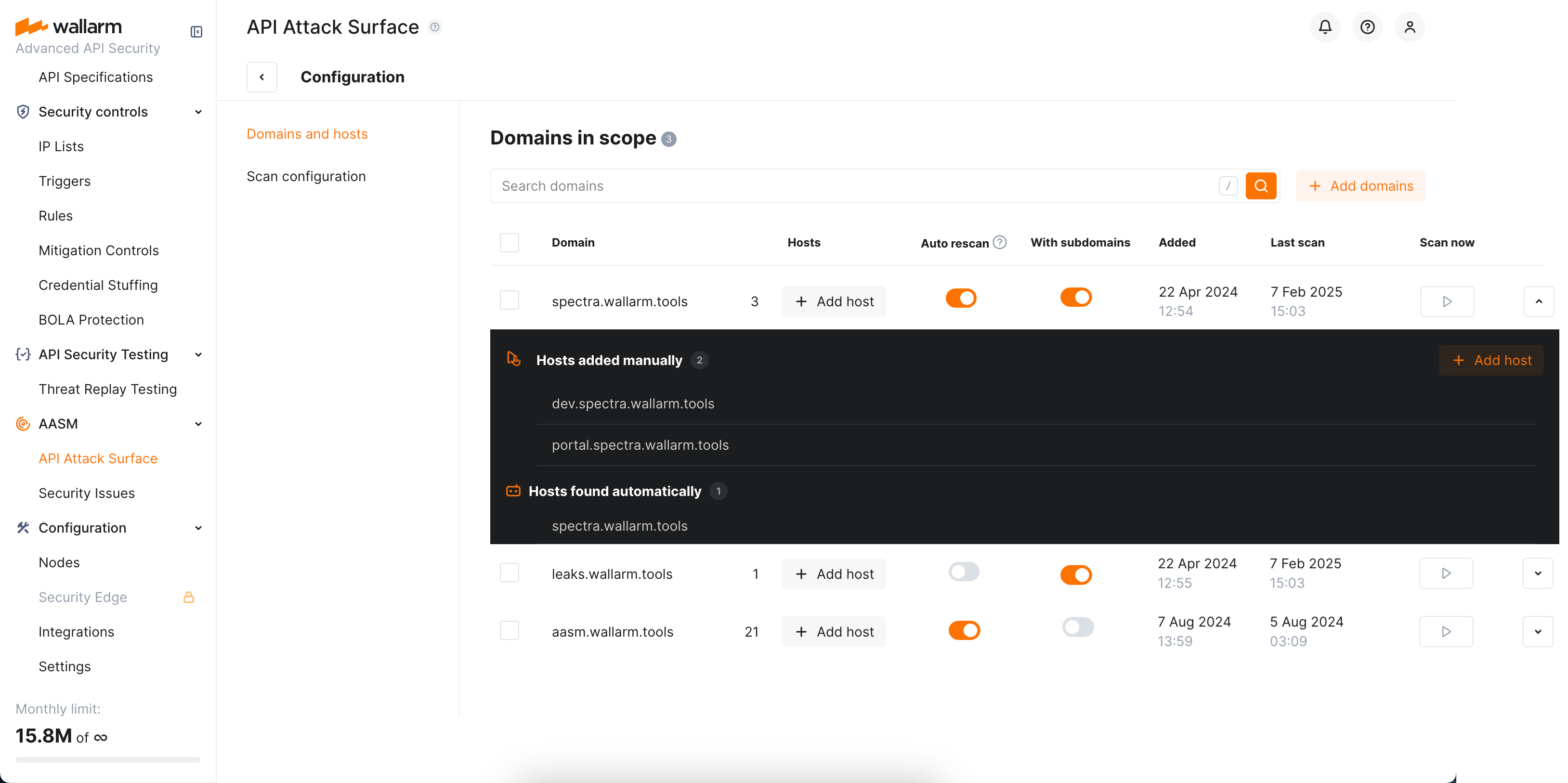 You can start scanning for any domain manually at AASM → API Attack Surface → Configure → Domains and hosts by clicking the Scan now button.
