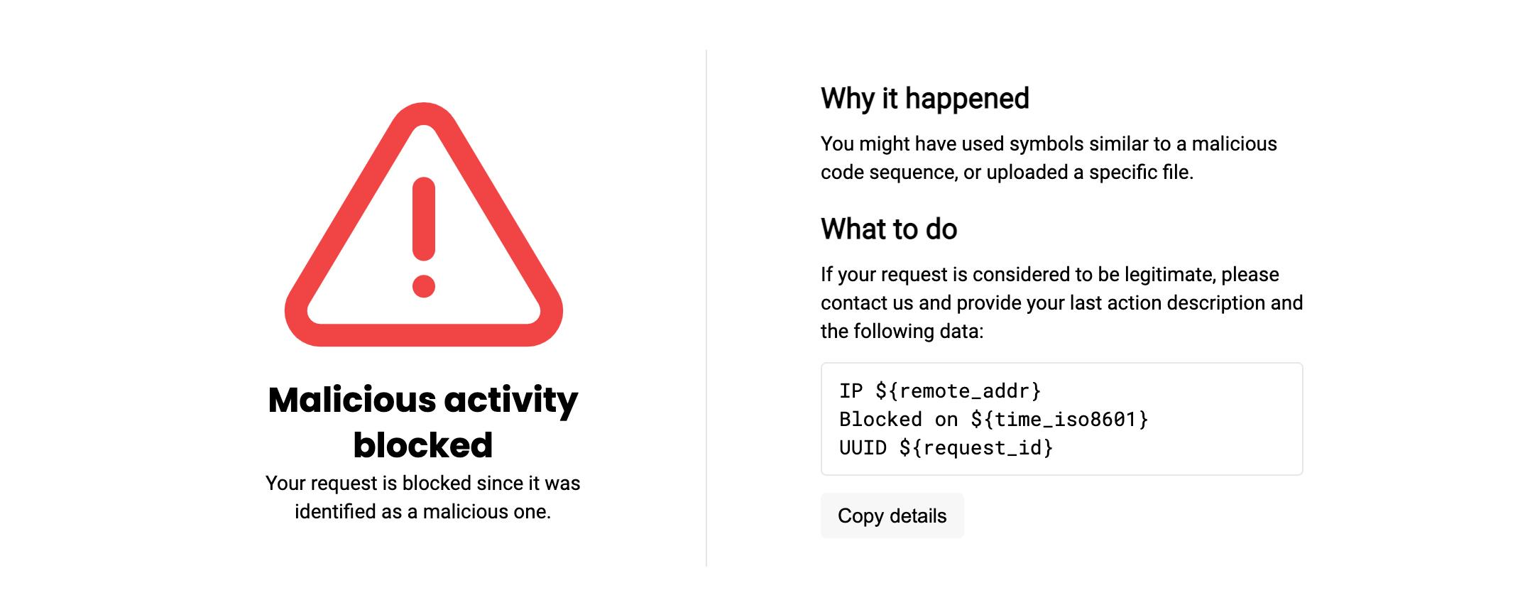 When the Security Edge Inline Node blocks a malicious request, it can return a styled block page along with HTTP 403 Forbidden response.