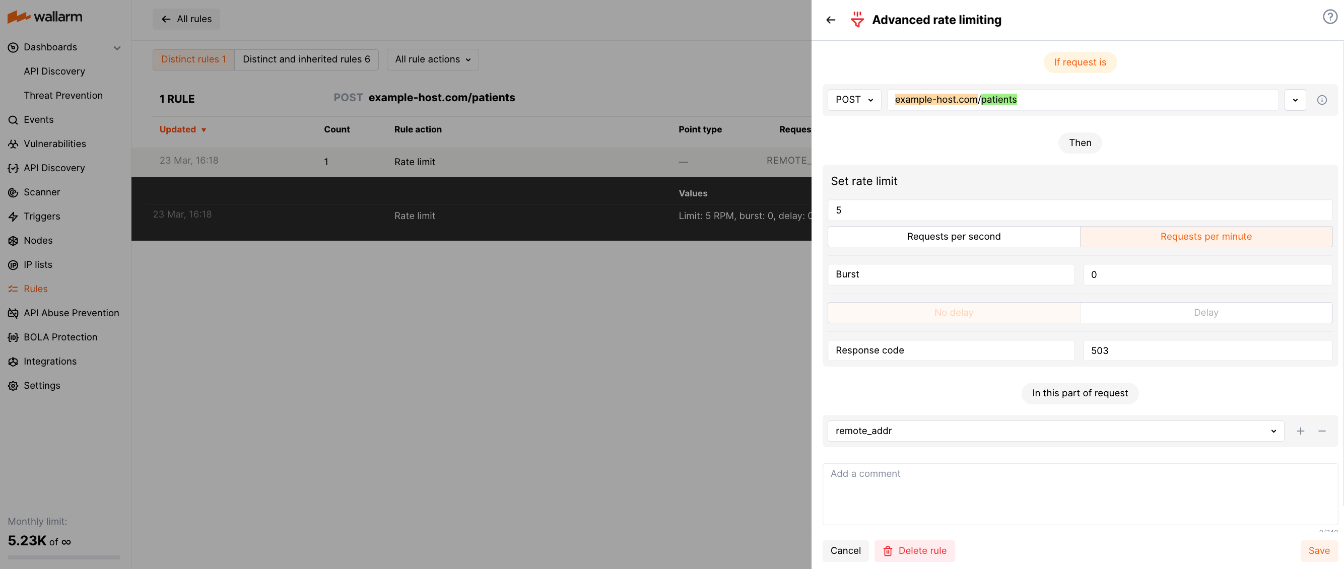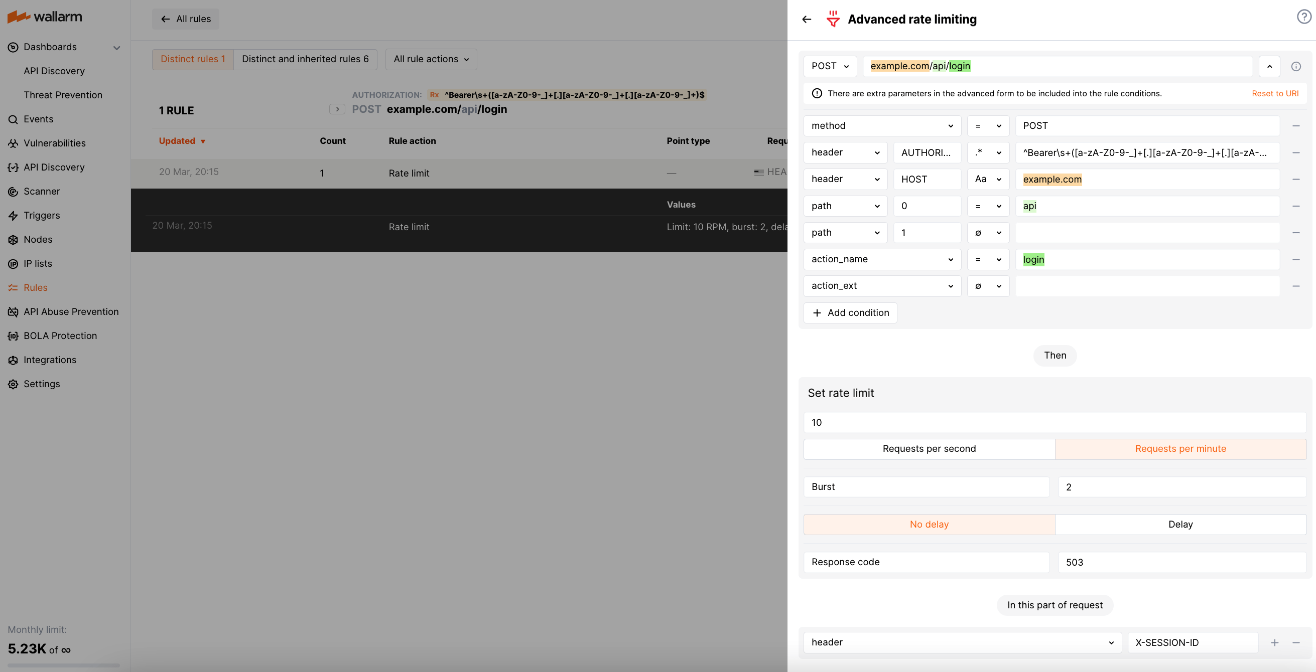 Wallarm provides the Advanced rate limiting rule to help prevent excessive traffic to your API. This rule enables you to specify the maximum number of connections that can be made to a particular scope, while also ensuring that incoming requests are evenly distributed. If a request exceeds the defined limit, Wallarm rejects it and returns the code you selected in the rule.