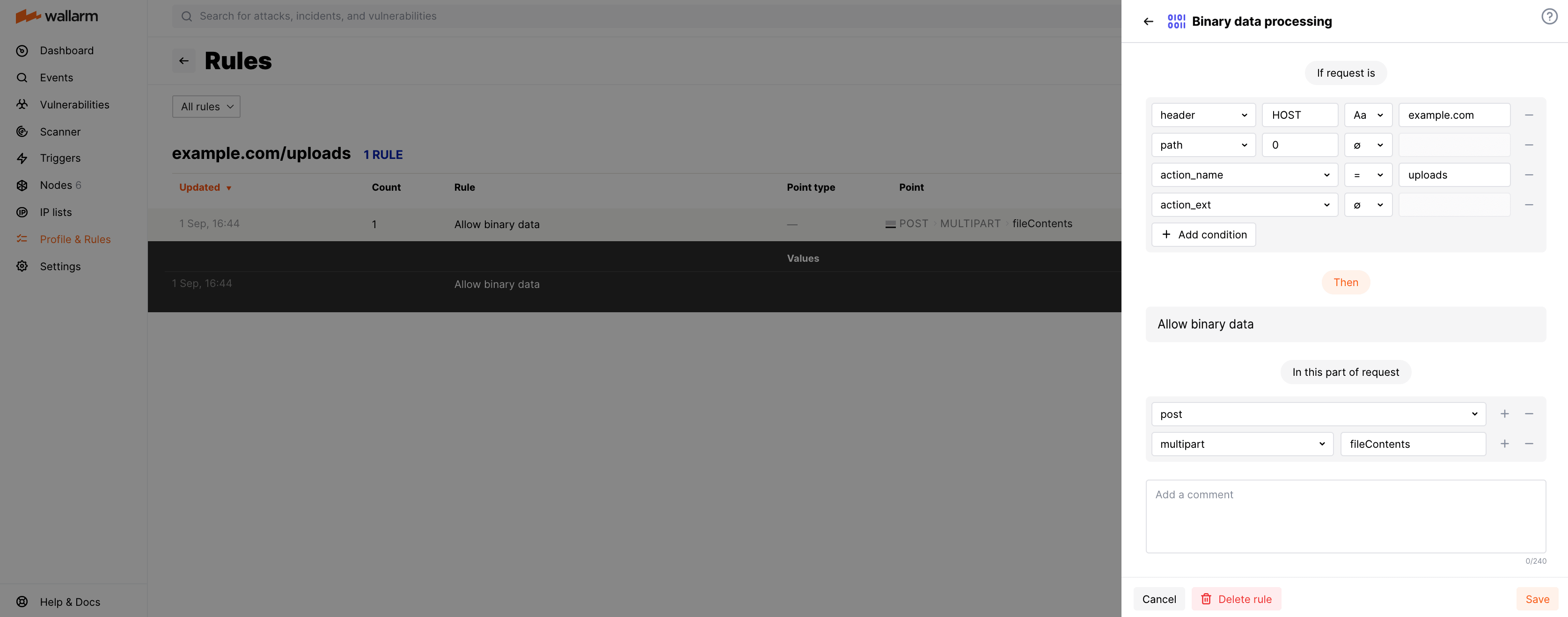 Using the Allow binary data rule, you can explicitly specify request elements containing binary data. During specified request element analysis, the Wallarm node will ignore the attack signs that can never be passed in the binary data.