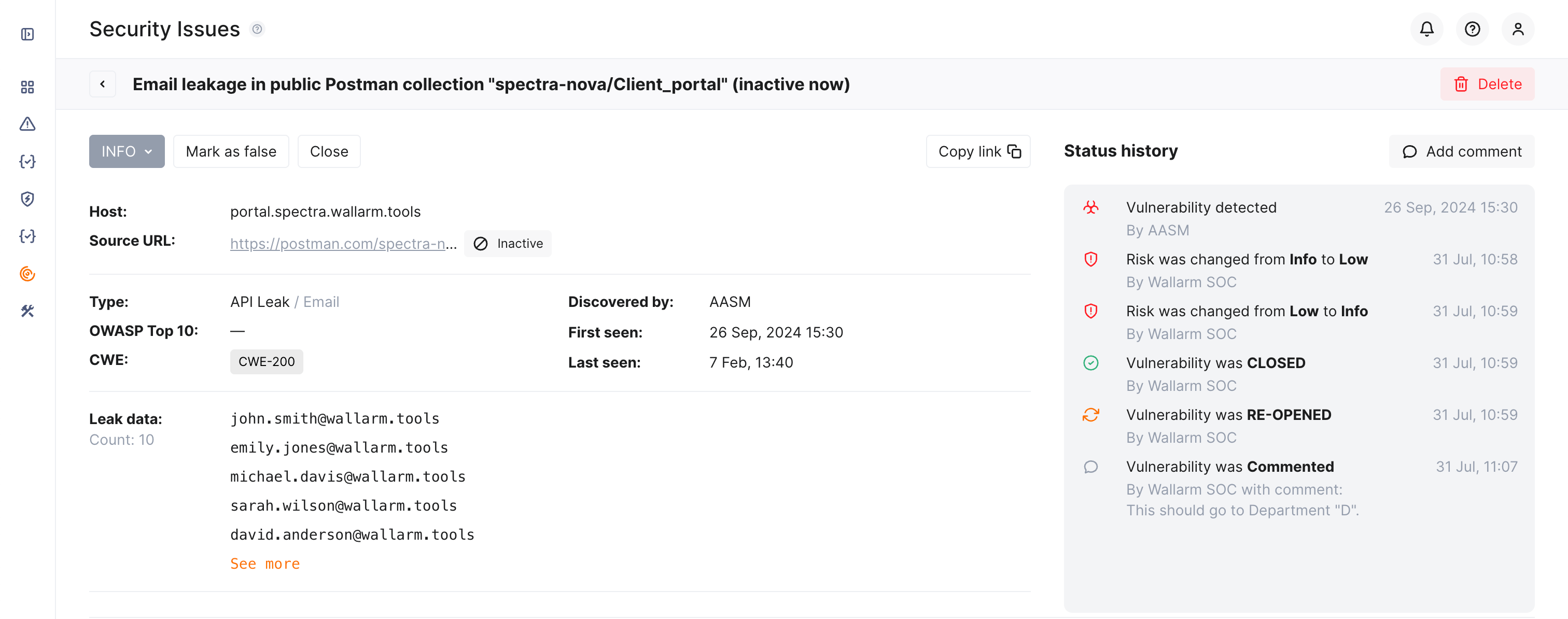 Among other types of security issues, Wallarm detects cases of public exposure of API credentials (API leaks). The leaked API keys can allow attackers to impersonate authorized users, access confidential financial data, and even manipulate transaction flows.