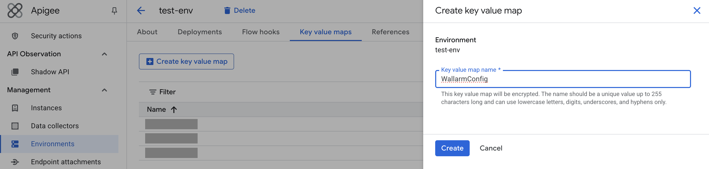 curl -X POST \ -H "Authorization: Bearer $(gcloud auth print-access-token)" \ -H "Content-Type: application/json" \ -d '{ "name": "WallarmConfig", "encrypted": true }' \ "https://apigee.googleapis.com/v1/organizations/<APIGEE_ORG_ID>/environments/\ <APIGEE_ENV>/keyvaluemaps"