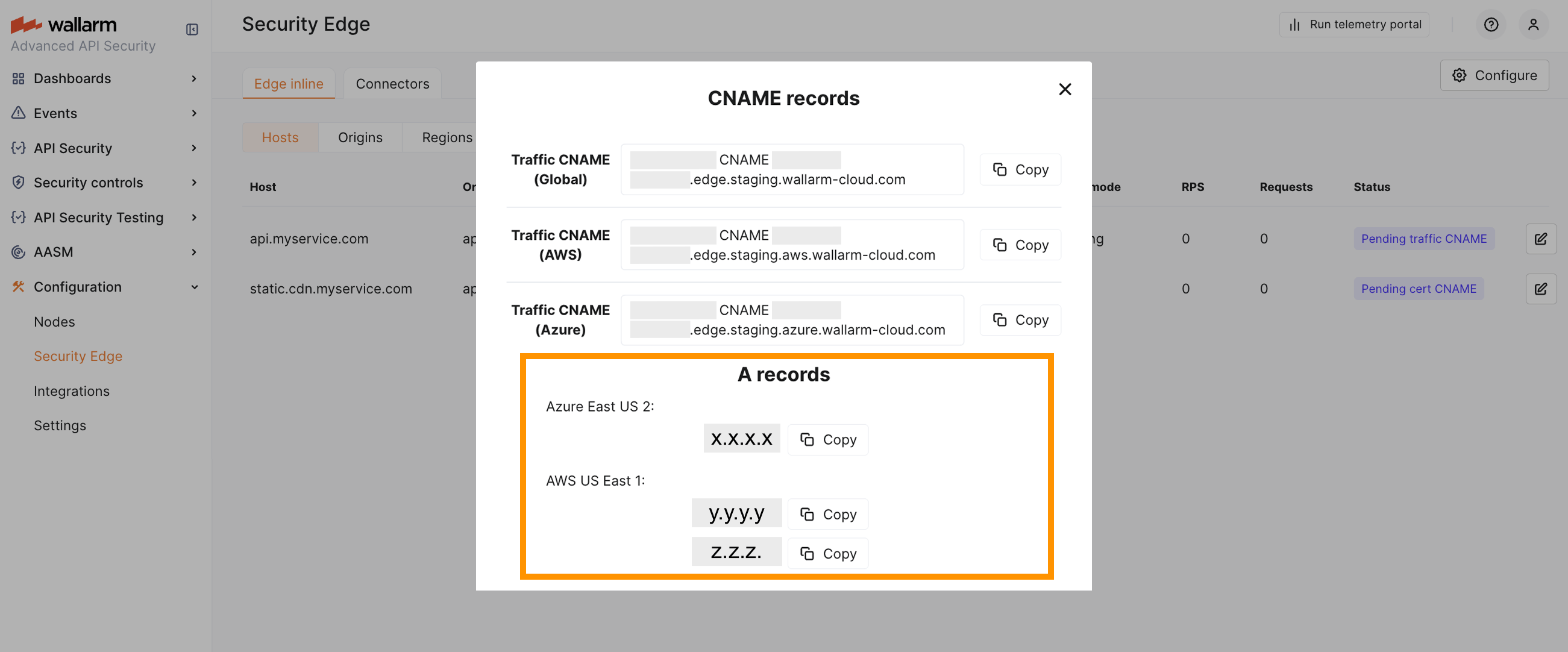 DNS changes can take up to 24 hours to propagate. Wallarm starts the Edge Node deployment once the CNAME records are verified (if needed).