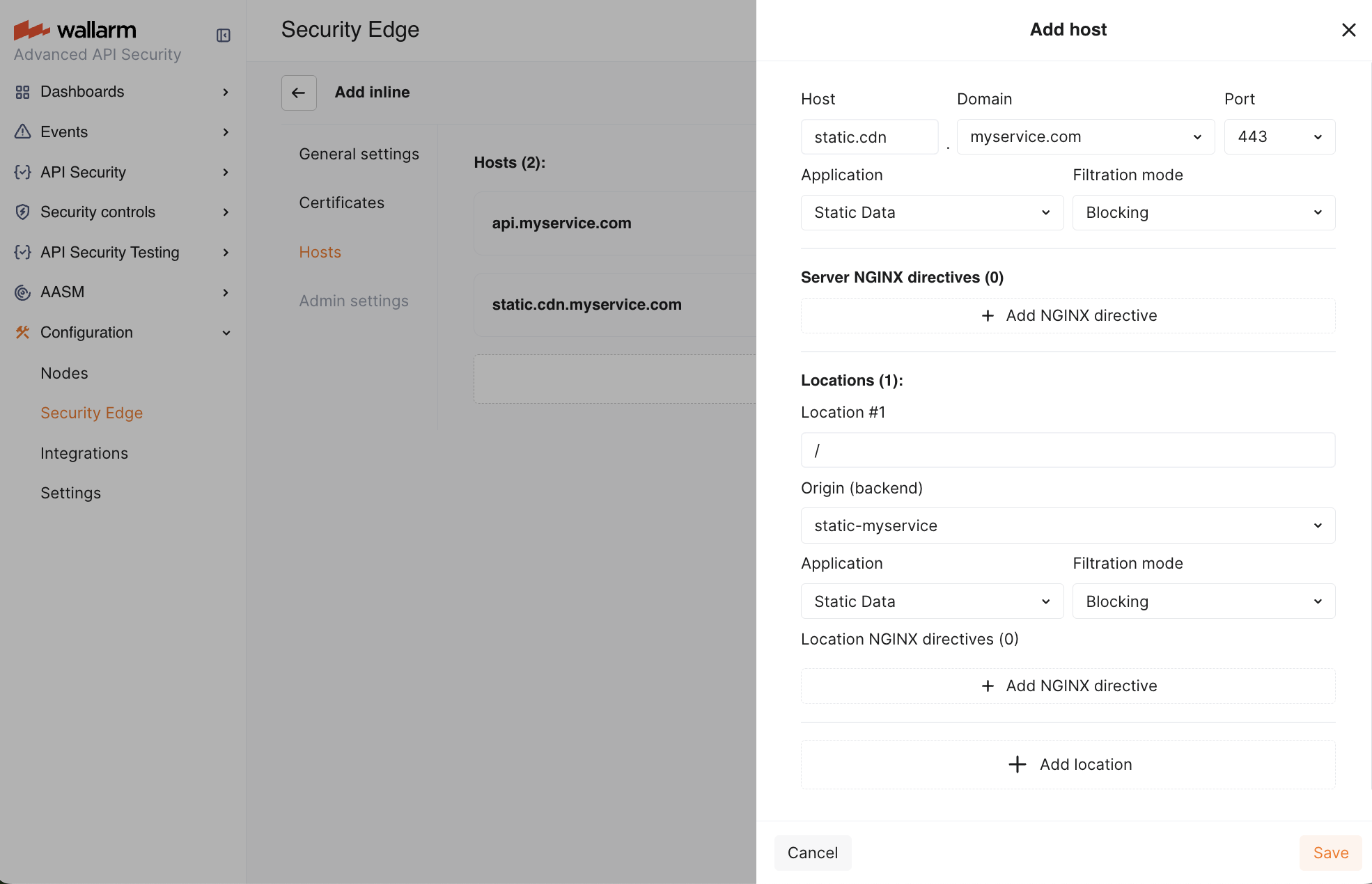 ):- Origin where the Wallarm Node will forward the filtered traffic (if no other location-specific settings are defined). The location's path is automatically appended to the origin.