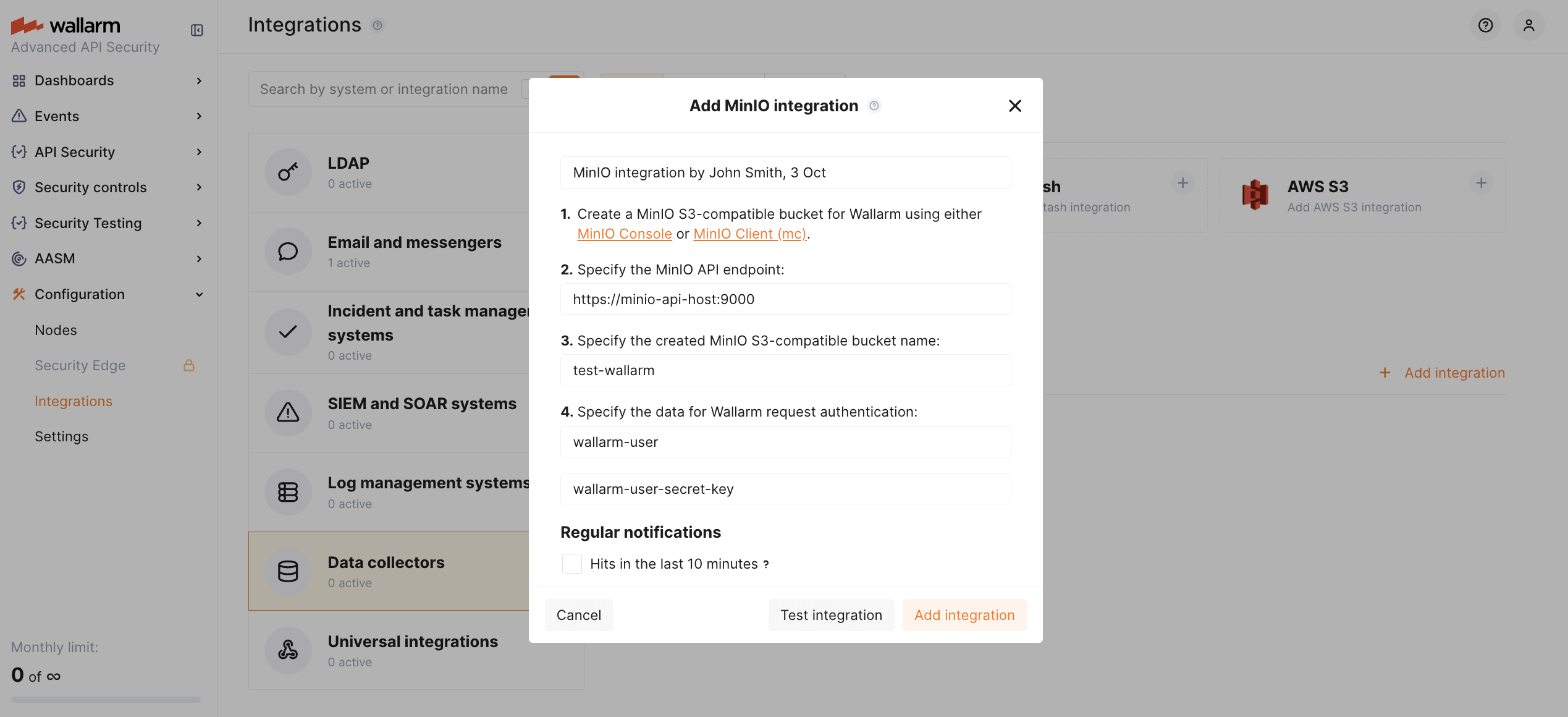 Proceed to Wallarm Console UI → Integrations → MinIO block or click the Add integration button and choose MinIO.