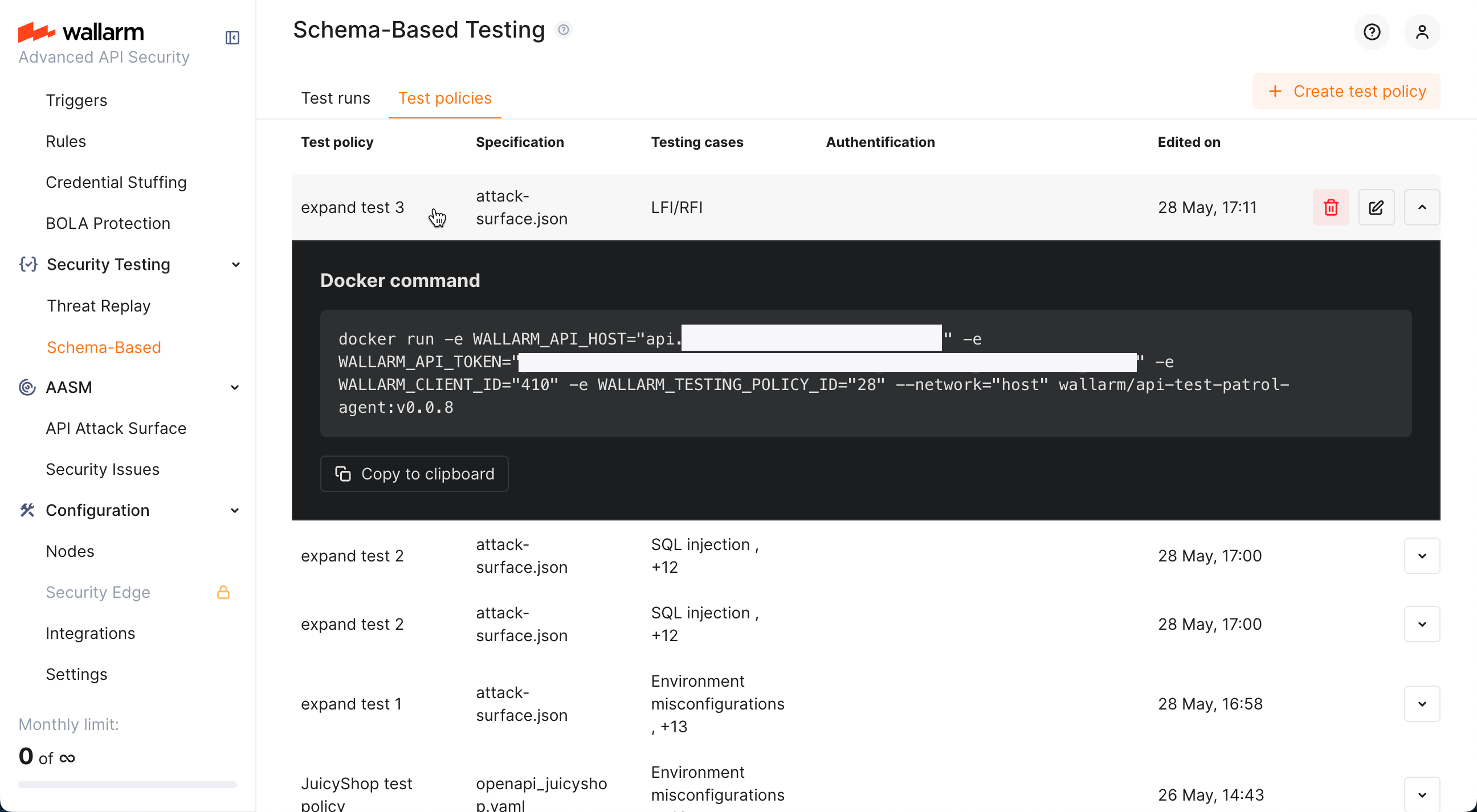 When you create and save a test policy in Wallarm, it automatically creates a Docker run command, adds all required -e